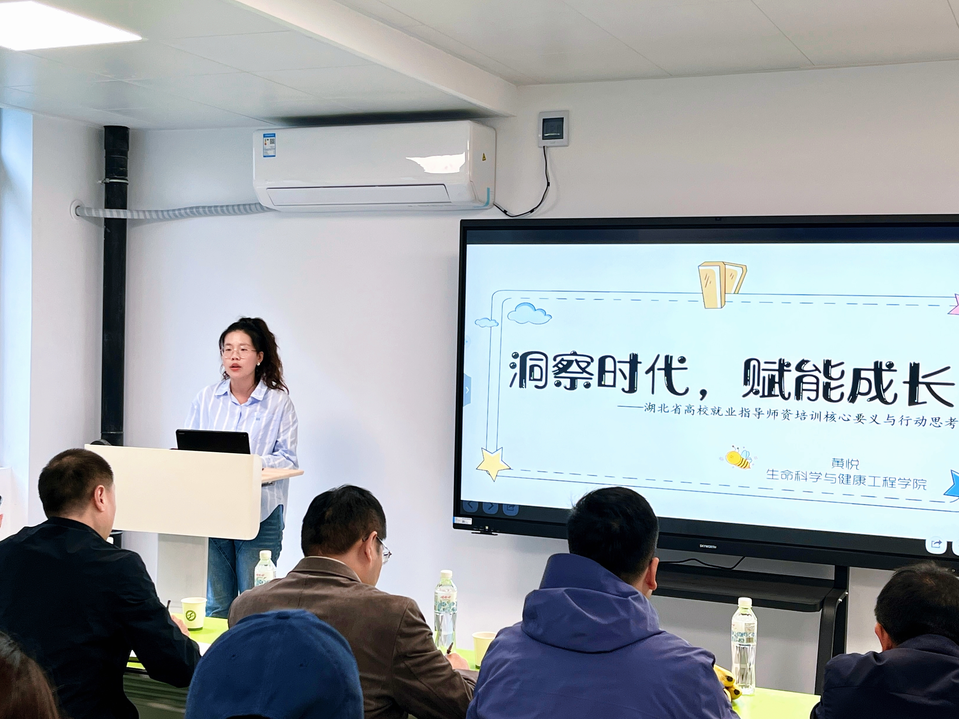 活动伊始,生命科学与健康工程学院研究生辅导员黄悦老师以“洞察时代,赋能成长”为主题,从时代之路、赋能之器、行动之路三个方面分享了参与湖北省高校就业指导能力提升师资培训的所学所想,她分享新时代高校就业指导一方面应更新就业指导理念,强化育人导向。在指导工作中更加注重引导学生主动适应经济社会发展趋势,打破求职地域局限,引导关注“产业蓝海”,树立正确的成才观、职业观、就业观,鼓励毕业生到基层、到国家重点领域建功立业;另一方面应提升课程教学能力,打造高质量就业指导课堂。学会运用新时代就业指导新方法、新技术,增强就业指导课程的吸引力、实效性和挑战度,切实提升就业指导课堂教学质量,推进精准分类指导,提升就业服务精细化水平。