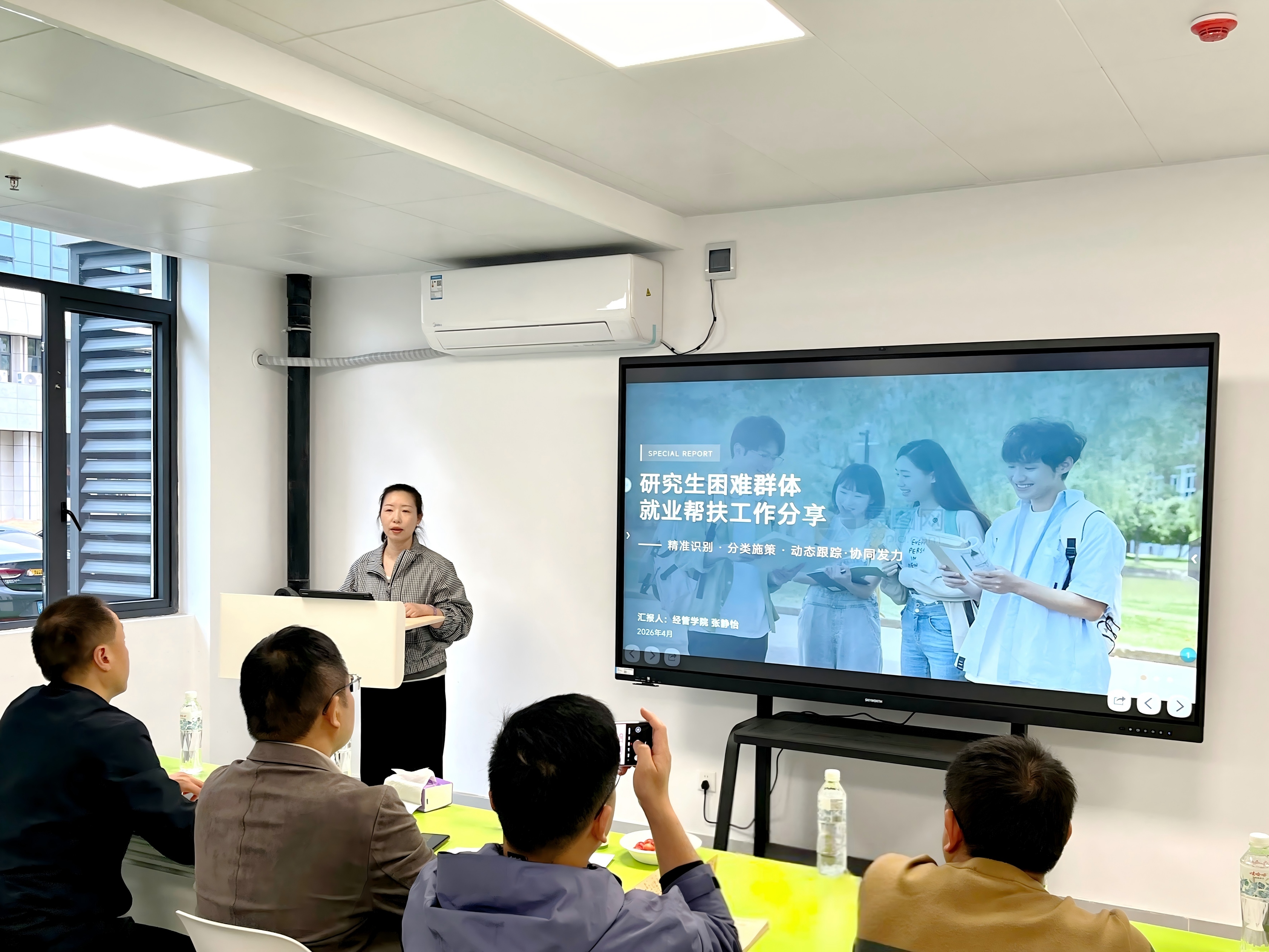 生命科学与健康工程学院和经济与管理学院研究生辅导员黄煌、张静怡两位老师就近期就业推进工作进行了汇报。黄煌以大数据分析学院就业台账为切口,详细介绍了学院在“学院领导-导师-辅导员-研究生”四方协同、校地企协同拓岗以及搭建校友就业资源等方面就业工作机制与进展;张静怡则聚焦于研究生就业困难群体分享就业帮扶工作,从精准识别、分类施策、动态跟踪、协同发力四个维度多措并举,全力帮扶就业困难学生就业圆梦。