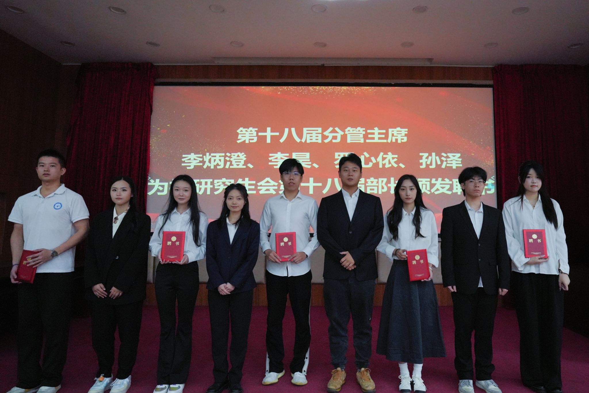 随后,校研究生会第十八届执行主席吴俊伟宣读校研究生会第十七届部长名单,第十八届分管主席李炳澄、李昊、罗心依、孙泽为校研究生会第十八届部长颁发聘书。完成上述任命仪式后,新任职各部门部长为部门干事佩戴工作证并合影留念。随后,第十八届研究生会执行主席吴俊伟宣读了新一届研究生会部长名单;分管主席李炳澄、李昊、罗心依、孙泽为新任职部长们颁发聘书,部长们为干事佩戴工作证并合影留念。
