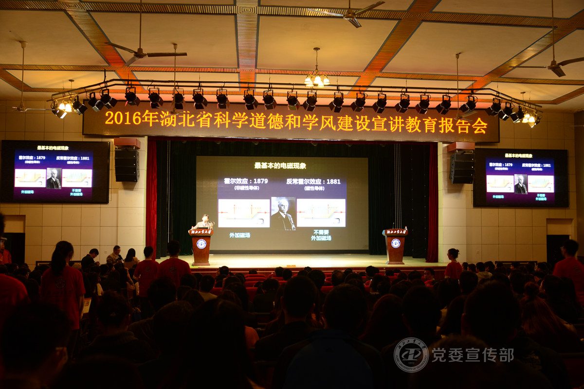 10月25日, 2016年湖北省科学道德和学风建设宣讲教育报告会在湖北工业大学大礼堂隆重召开,中国科学院院士、清华大学副校长薛其坤为来自湖北工业大学等全省28所高校和科研院所的近千名教师和研究生作宣讲报告。湖北省科学技术协会主席马忠星致辞,报告会由湖北省教育厅副厅长黄俭主持。