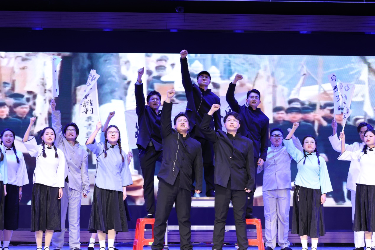 在活力风采展示环节,计算机学院研究生卓研党支部通过元宇宙与历史穿越的独特视角,以创新形式生动演绎“五四精神”。舞台上,从“红色元宇宙”穿越回百年前的五四运动现场,观众随着主角的视角,目睹了学生们在北洋政府面前勇敢发声的感人场景。铿锵有力的呼喊“还我青岛,保卫主权!”响彻全场,将百年前的爱国热血带入现代,深深打动了在场观众。