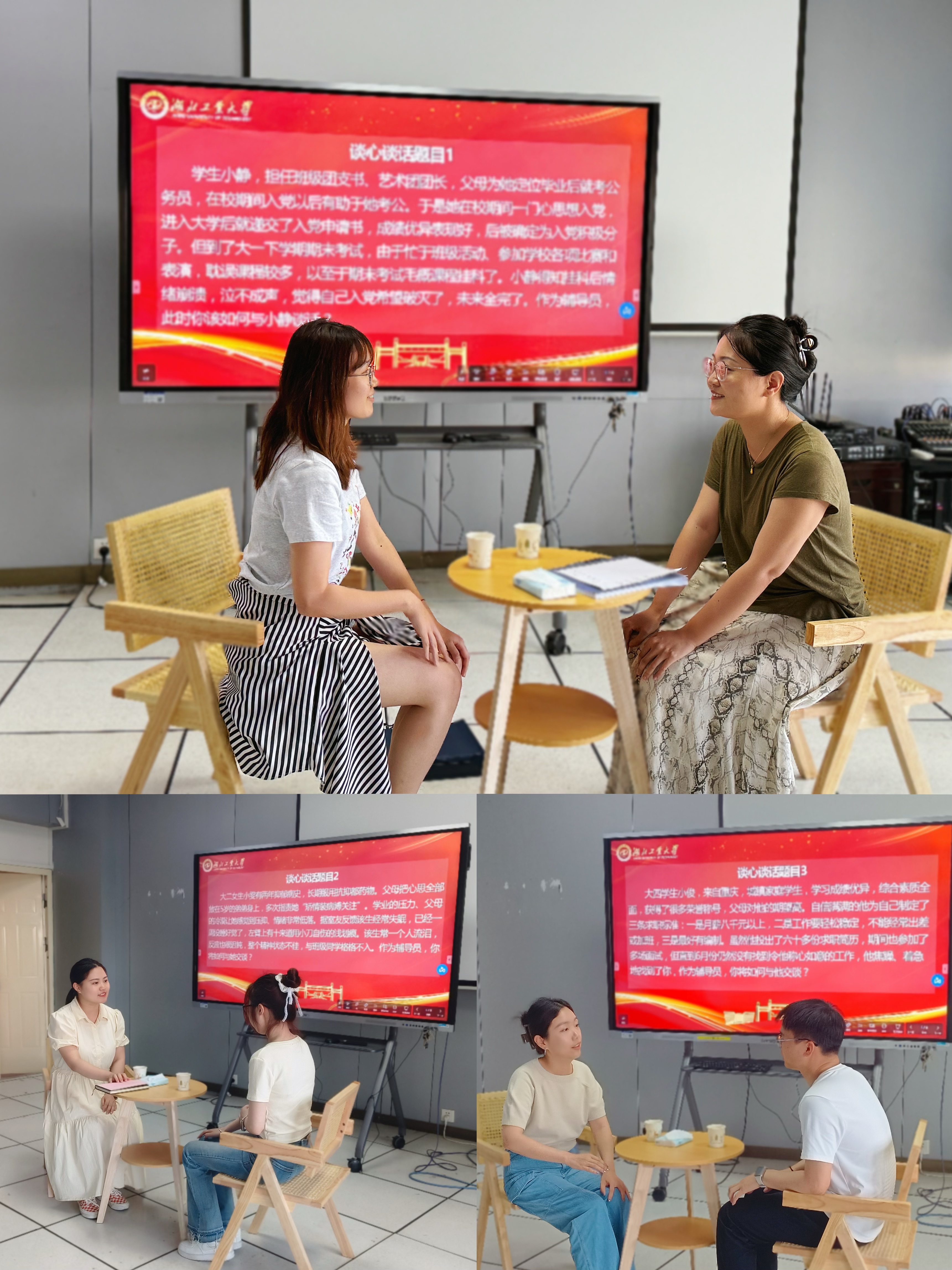 随后,土建学院研究生辅导员尚益名、计算机学院研究生辅导员任京、艺设学院本科生辅导员吴华聪三位老师现场与学生进行了模拟谈心谈话,杨荷对三位老师的谈心谈话表现进行了深入点评。