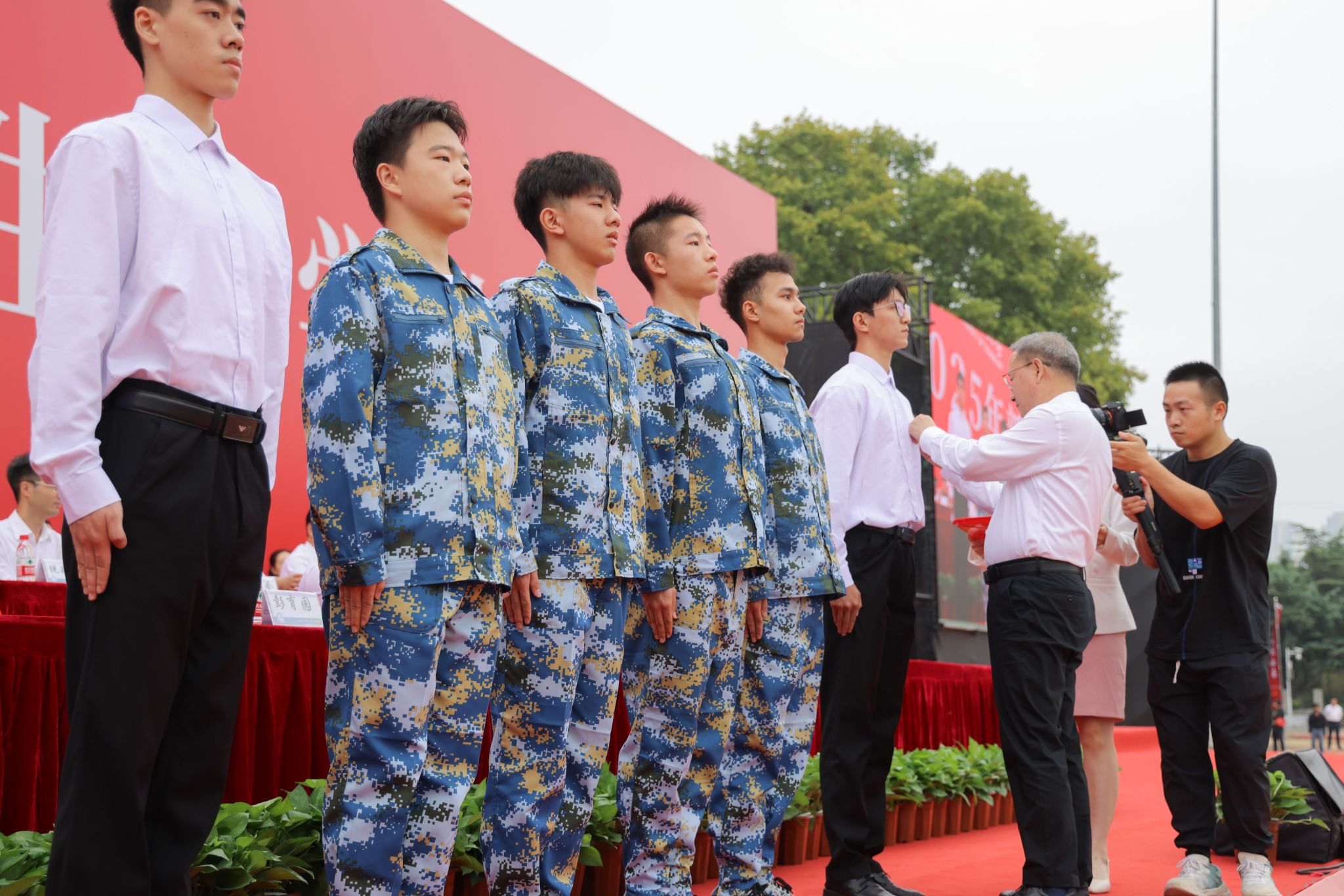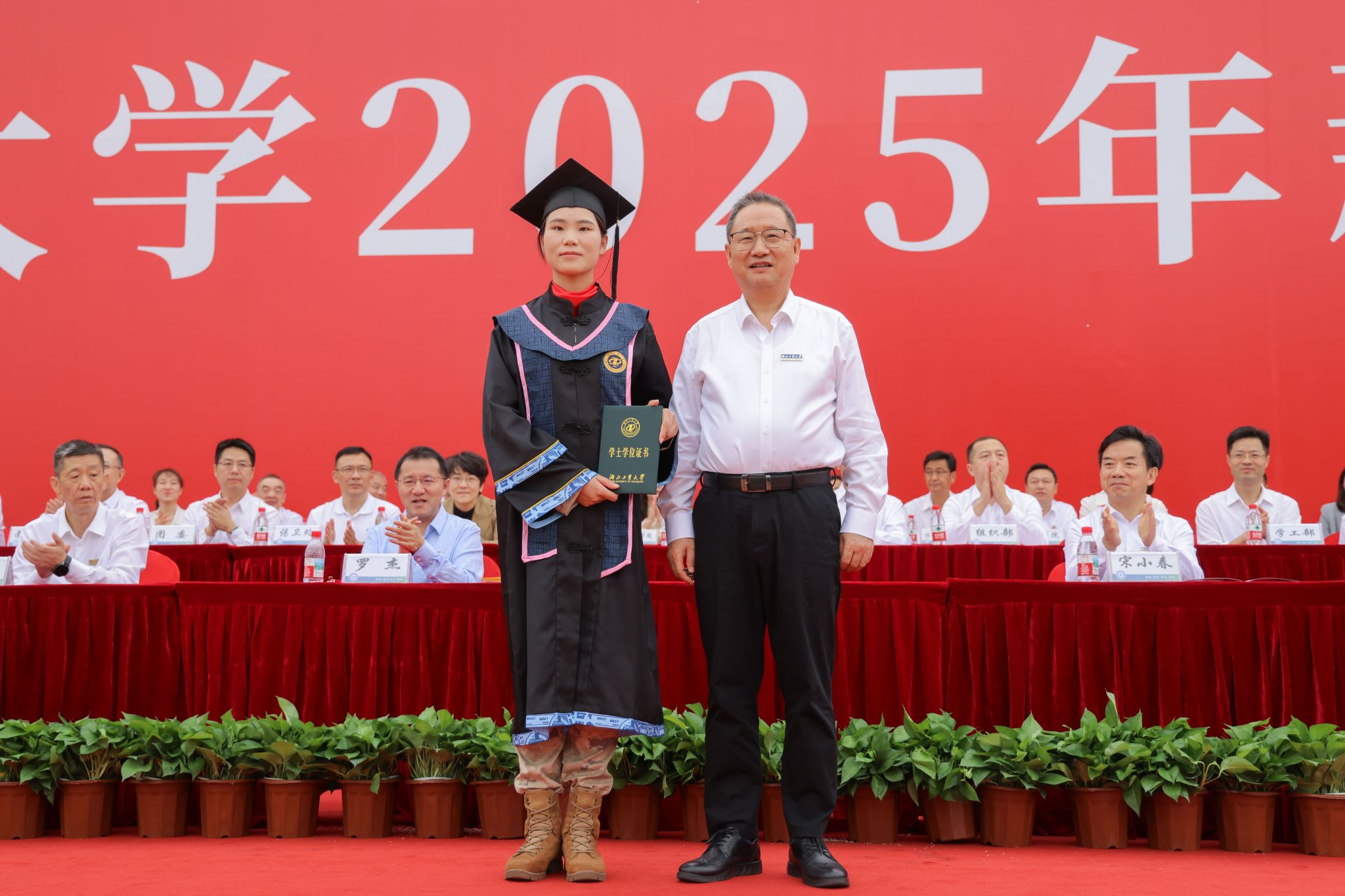 彭育园特为因参加“9.3”阅兵而错过毕业典礼的翟玉环同学进行一场特殊的学位授予仪式,亲自为其拨穗正冠。