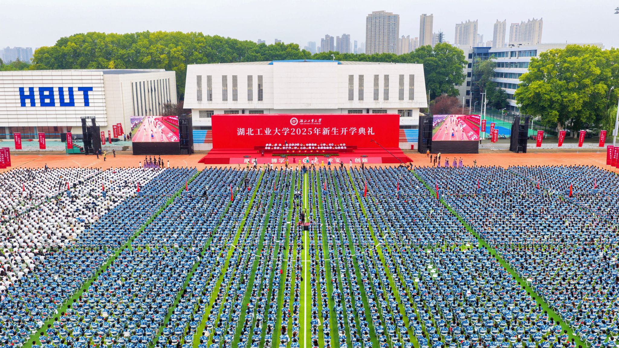 9月26日早上,湖北工业大学2025年新生开学典礼暨“开学第一课”在中区操场隆重举行。8000余名来自五湖四海的2025级本科生、硕士生、博士生怀揣梦想与憧憬,齐聚于此,共同开启在湖北工业大学的崭新人生篇章。校党委书记彭育园教授、校党委副书记、校长宋小春教授等全体在校领导、1994届校友罗杰教授、教师代表马强及各学院、各职能部门(单位)负责人、新生辅导员出席典礼。典礼由校党委副书记、副校长桂丽主持。