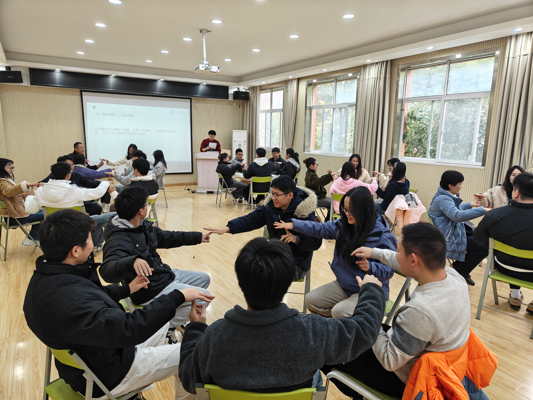 本次活动创新采用导师与学生共同参与的模式,围绕“年度复盘”与“能量启航”两大主题,通过结构化团体心理辅导,引导研究生及导师群体以积极视角梳理过去、展望未来,共同构建支持性学术成长生态。活动中,师生共同成为“研途旷野上的探险者”。在安全、信任的团体氛围中,师生们坦诚分享过去一年的“蛰伏”、“扎根”或“转换”,导师们则从陪伴者的角度倾听、反馈,见证学生的成长脉络,并通过“发现同伴地图上的星光”环节,强化彼此的正向关注与支持。特别的“轻装前行”仪式,鼓励师生一同放下不必要的心理负担,明确未来珍视的核心力量,体现了心理育人工作对研究生群体情感体验与精神需求的细致关照。