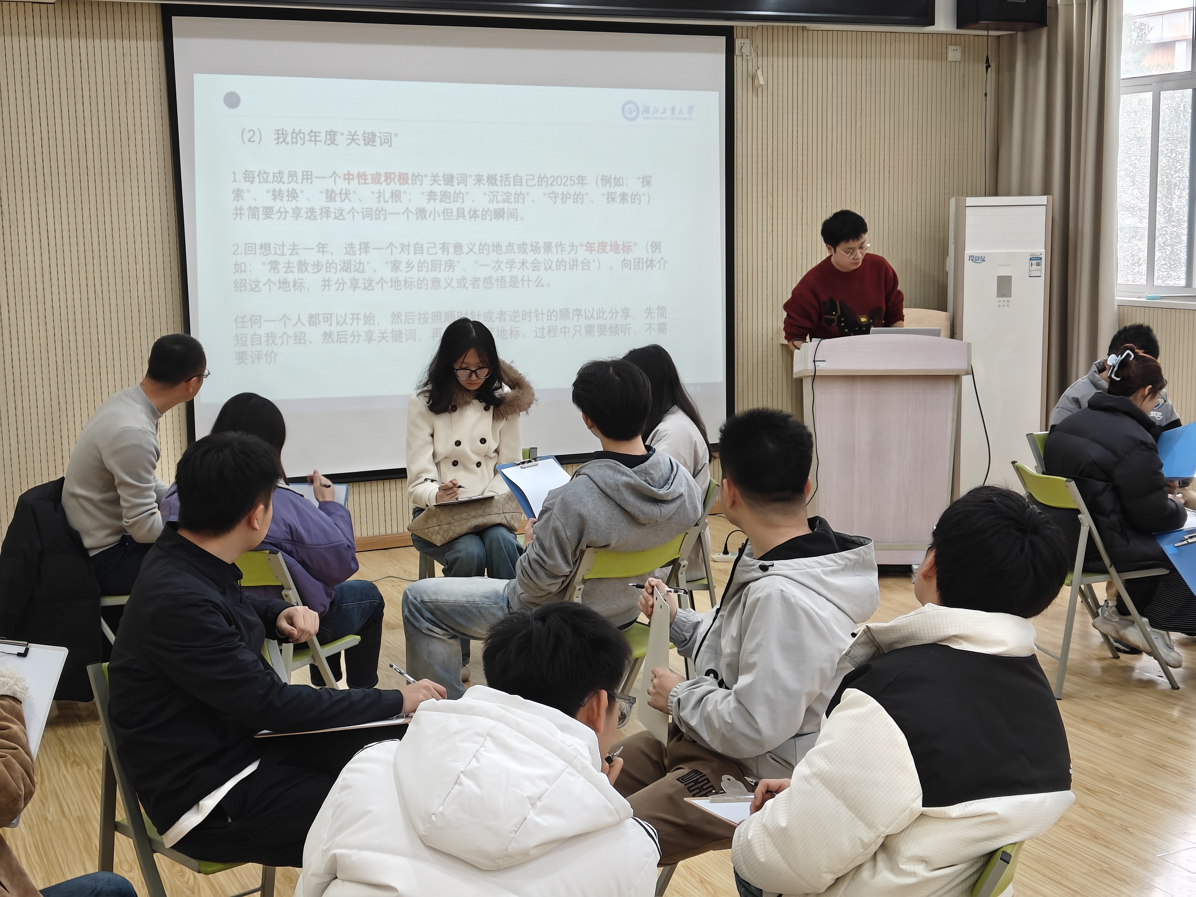 为推进我校研究生心理育人工作向更精准、更人文、更具品牌特色化方向发展,2025年12月30日,党委研工部联合心理健康教育与咨询中心成功举办了一场别开生面的“研途心光——年度复盘与展望团体心理活动”。本次活动由心理教师蔡宇轩带领,机械工程学院、土木建筑与环境学院和经济与管理学院导师代表、研究生辅导员代表以及24名研究生同学参与。