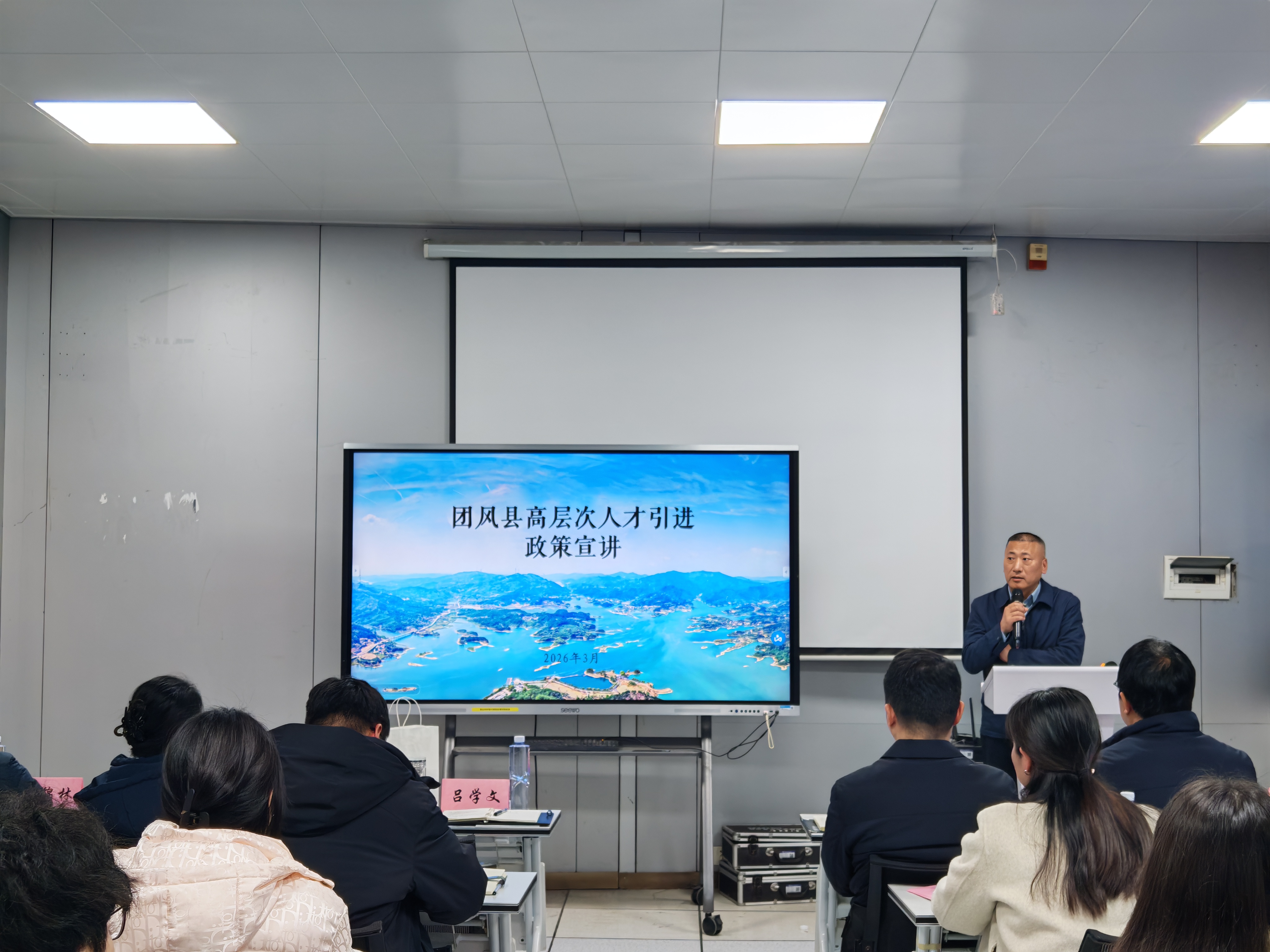 随后,团风县县委组织部郭玉岑向现场同学全面细致宣讲与解读本次引进人才的政策,阐明了引进岗位、资格条件、相关待遇等核心信息。团风县人力资源和社会保障局党组书记吕学文则从自然禀赋、人文底蕴、经济发展三个维度,全面介绍了团风县的发展优势与美好前景,同时对引进人才相关政策进行了进一步细化解读,并提醒同学们本次引进人才报名截止时间为3月24日,诚挚欢迎我校毕业生踊跃报名,毕业后到黄冈、到团风建功立业。