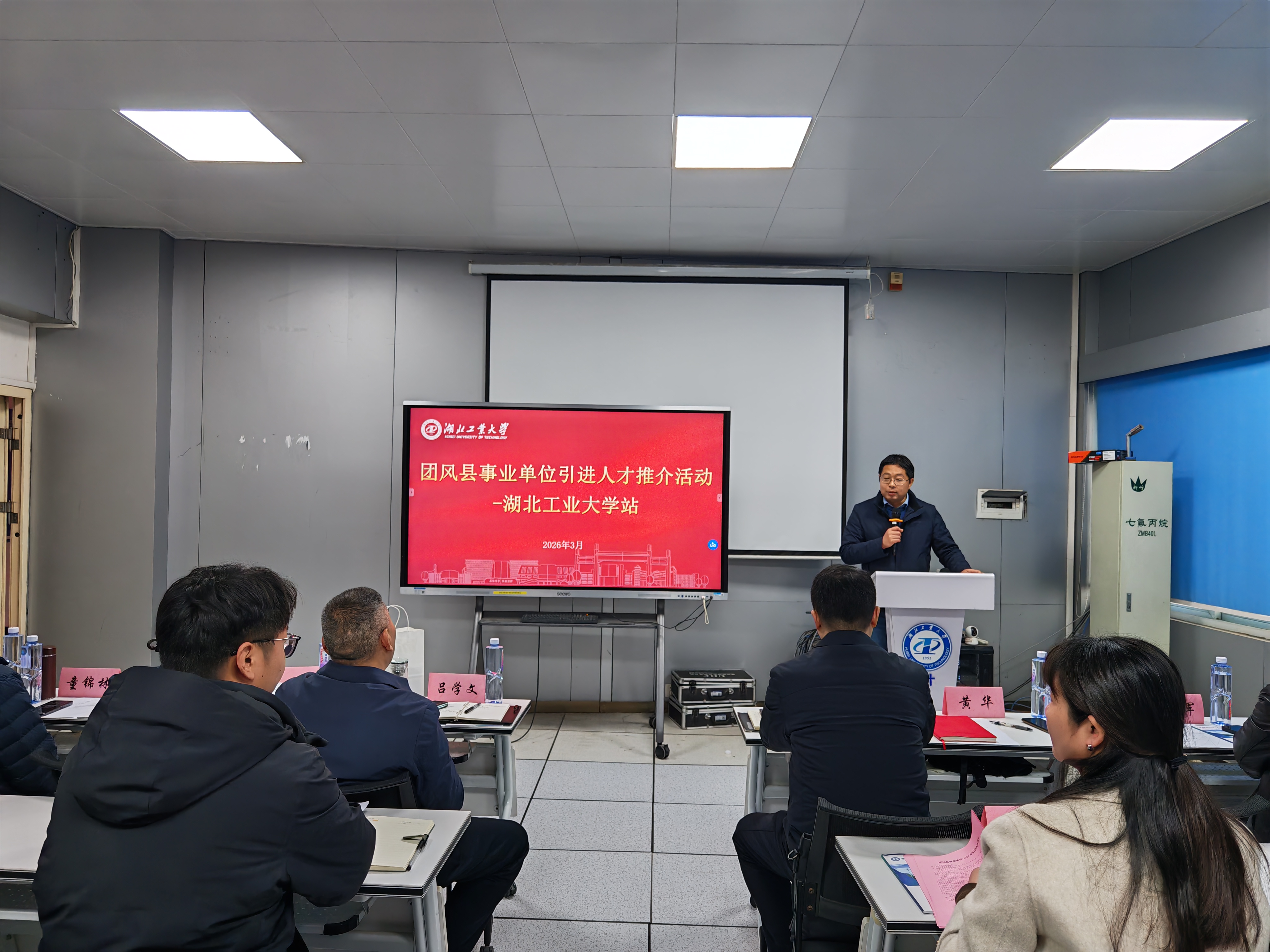活动伊始,黄华代表研工部、研究生院对团风县来访人员表示热烈欢迎,介绍了我校基本情况、研究生培养和就业相关情况。他表示,长期以来,学校始终坚持“立足湖北、服务工业”的办学导向,积极引导研究生服务区域经济发展,我校研究生留鄂就业率已连续多年保持在50%以上,并呈稳步上升之势,为全省加快建成中部地区崛起重要战略支点贡献了湖工大力量。2025年,有22名毕业研究生主动选择回到黄冈、扎根团风。黄华鼓励参会研究生立足专业所长,毕业后积极投身团风县各项建设事业,在服务地方发展伟大实践中成就精彩人生。