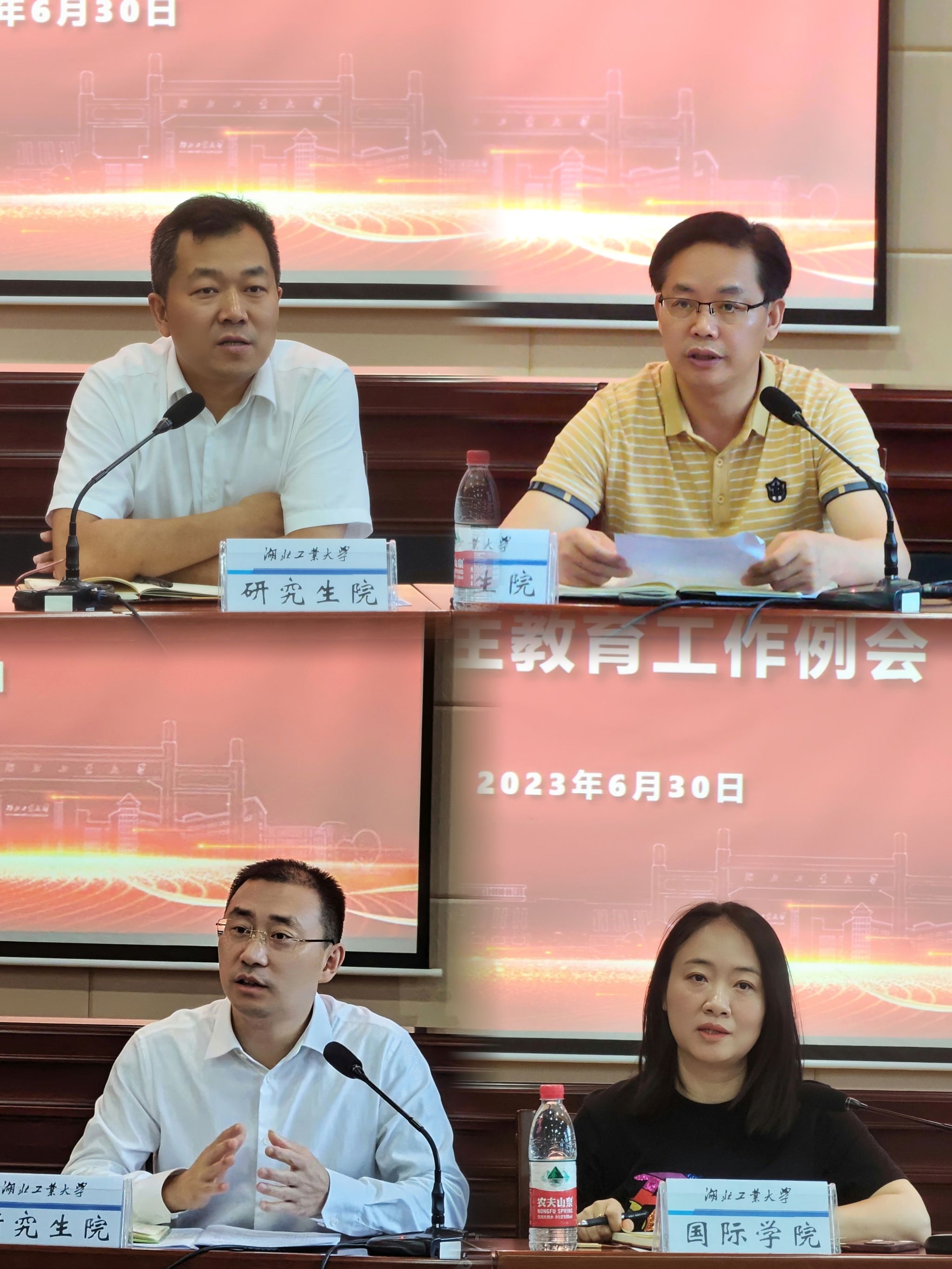 会上,武明虎对上半年研究生教育工作进行了全面总结,对照各项统计数据,回顾工作亮点,指出有待提升之处,并对近期重点工作进行了部署与安排,对研究生招生宣传工作进行了重点强调。研究生院副院长钱应平对2023级研究生培养方案修订、卓越工程师联合培养研究生培养方案制订、中外双导师联合培养研究生项目相关人员名单确定、导师培训、中期检查等教育教学培养工作进行了安排和提醒。研工部副部长、研究生院副院长宋发佳对招生宣传、就业帮扶、党建思政、研究生创新实践系列竞赛和研究生安全教育等重点工作进行了梳理和部署。