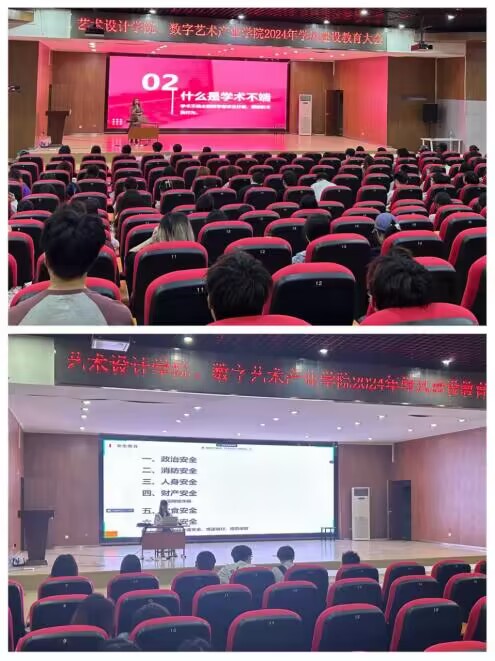 2024年4月26日上午,艺术设计学院、数字艺术产业学院2024年学风建设暨安全教育大会在艺术设计学院报告厅召开。王欣副院长和研究生辅导员张静仪、刘雅文主讲。