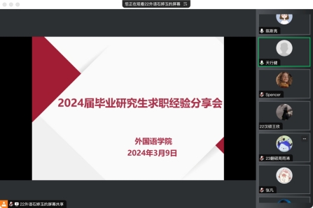 为了丰富学生的求职视野,帮助学生明确职业发展方向,外国语学院于3月9日成功举办线上求职经验分享会。本次活动邀请了三位优秀毕业生,他们向与会者传授了求职过程中的宝贵经验。外国语学院副院长李池利出席了本次会议,会议由外国语学院研究生辅导员陈斯亮主持。此次分享会吸引了来自2021级、2022级和2023级的研究生参与。