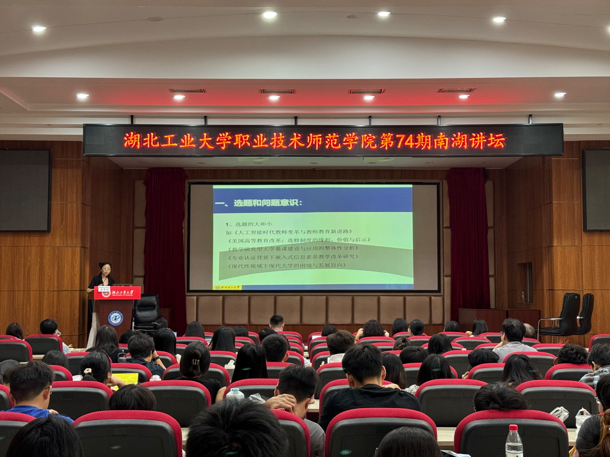 2024年9月25日,湖北工业大学职业技术师范学院“第74期南湖讲坛”开讲。本次讲坛邀请到现任 《高教发展与评估》执行主编、湖北省科技期刊编辑学会常务理事、中国交通教育研究会高教分会理事荣翠红专家,讲座主题为《高等教育学术论文应该规避的几类问题及举例分析》。讲坛由湖北工业大学职业技术师范学院张和平教授主持。学院全体教师和研究生、部分本科生参加。