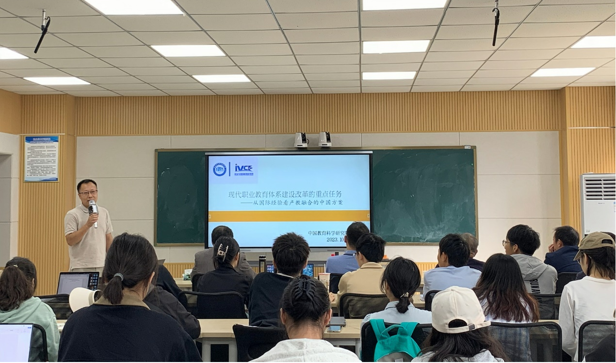 张浩教授围绕我国职业教育体系建设改革的顶层设计、产教融合的难点、德国的历史经验、英国的现代改革、中国之路五大板块进行论述。在顶层设计方面,张浩教授向师生们展示了我国近年来有关职业教育的重要政策;在产教融合难点方面,从“谁要付出”、“付出多少”进行了深入分析;在德国经验上,细致阐述了德国学徒制的演进历程,同时对德国的历史经验也做出了系统性总结;并对英国现代职业教育改革中雇主优先政策进行了深入剖析。最后张浩教授基于上述多维因素提出了我国职业教育体系建设改革的中国之路。