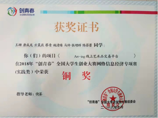 在“创青春”大赛中,饶鉴老师带领团队参加网络信息经济专项赛和创业实践挑战赛,为提高团队的综合能力,对每位同学进行了针对性的项目梳理与指导;在国赛中饶鉴老师亲自带领同学前往浙江金华,在老师赛前的悉心指导下,团队成员们发挥出色,最终取得了国家级铜奖和省级铜奖的好成绩。