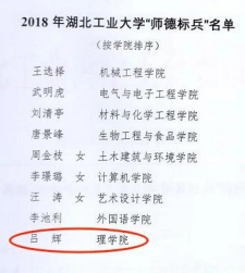 吕辉老师爱岗敬业,诲人不倦,师德高尚,其教学的课程深入浅出,化繁为简,循循善诱,深受学生好评。课后善于与学生沟通,与学生打成一片,曾获校师德标兵。